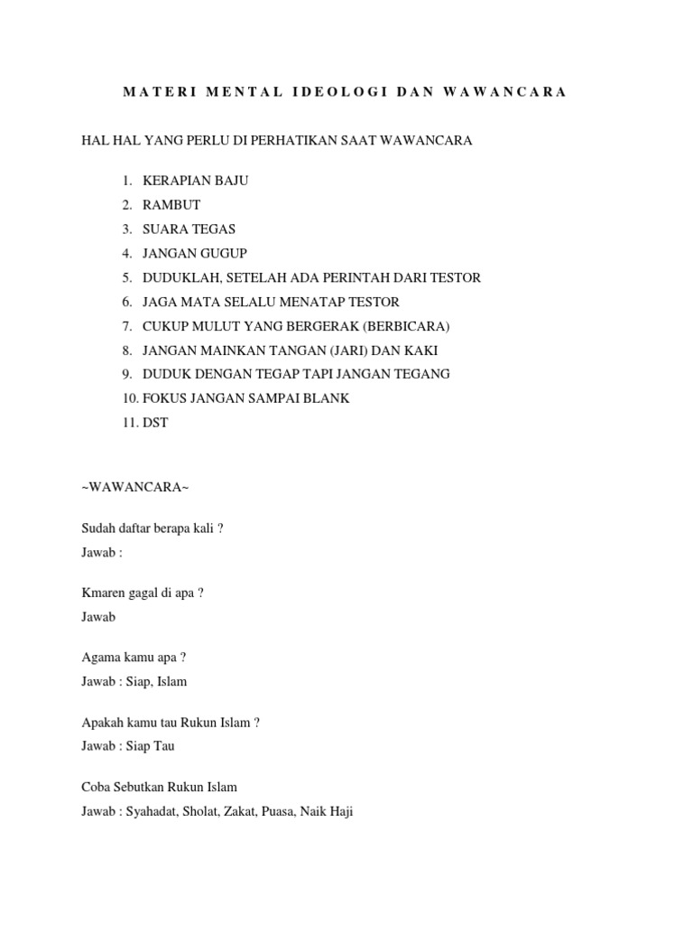 Jika tes mental ideologi dijawab menggunakan tulisan maka berbeda dengan bentuk soal wawancara yang dijawab dengan lisan. Contoh soal pertanyaan dan materi seputar tes mental ideologi tni polri admin june 18 2020 koranmiliter untuk menjadi seorang prajurit tentara nasional indonesia tni ataupun polisi setiap peserta akan menghadapi serangkaian tahapan tes yang sangat ketat. Kemudian anda bisa mengetahui jawabannya.